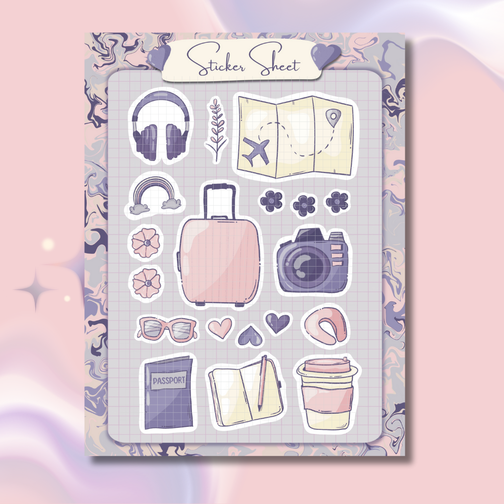 Jet-set in style with these travel-ready doodles! This sheet includes luggage, passport, camera, headphones, and other essentials to document your journey — whether you're scrapbooking your dream trip or just planning a weekend escape.