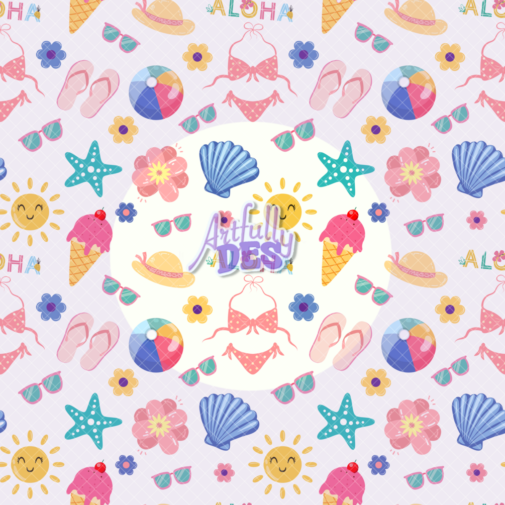 Bring the sunshine to your designs with this cute summer seamless pattern, filled with tropical fun! Featuring playful elements like sunshine, sunglasses, watermelon, beachwear, and more – all drawn in a kawaii-style – this repeating pattern is perfect for fabric prints, sticker sheets, sublimation, wrapping paper, and print-on-demand products.